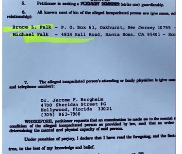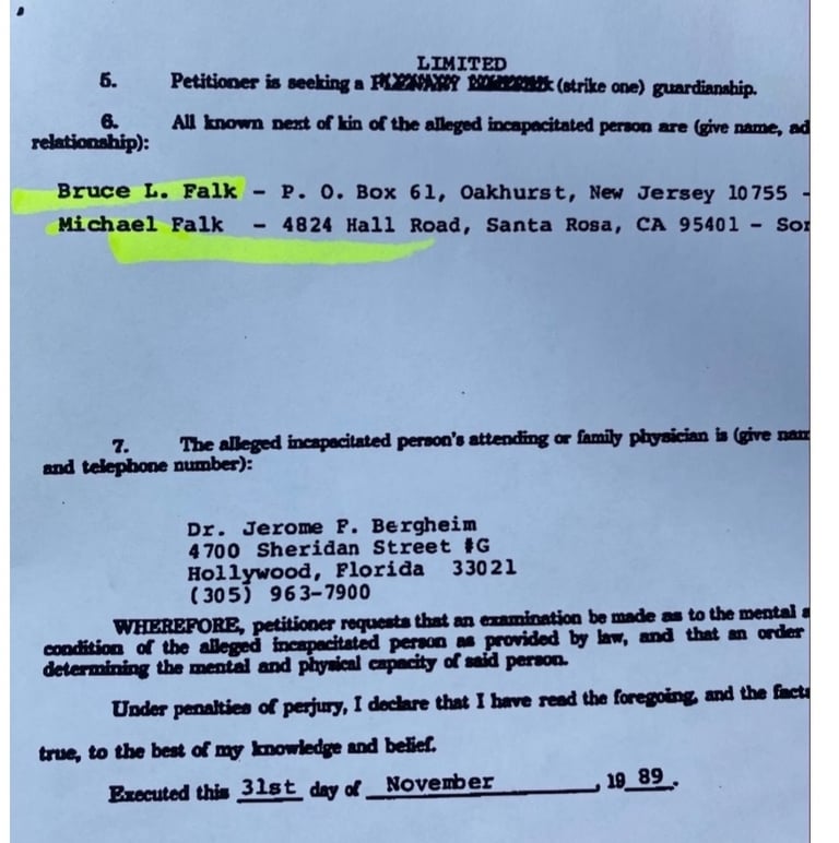 The Falkin' Truth in Florida? There's been seventy years of crazy running around trying to "Conserve" One another for control of you guessed it, money. My father's not original. Samuel "Fortune" Falk? His brains literally fried from ECT in Florida where he was conserved to his wife Gertrude Falk, and then you have the "Brothers Falk" running all over themselves trying to conserve my Mother in Law Gertrude Falk. You want crazy? Look at the Falk nuts.