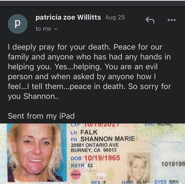 Hot and heavy trauma began on Christmas Day 2005 when I drove away from Oregon to get a California divorce. No surprise the ex lied. You, expect that, but your own brother Jason Willitts and your father Bill Willitts? Twenty-three years later? Willitts Designed Shannon Falk Death Affidavit's? Are 3 dudes crazy?!