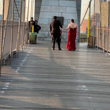 My grandmother used to say if everyone jumped off the Golden Gate Bridge would you do it too? To be fair? My grandmother was referring to being a born rebel and not following the crowd, and in San Francisco people fly from all over the world to that bridge to make their dying iconic. I wonder if the two couples in May I happened upon during a sunrise walk on the Brooklyn Bridge weren't trying to make their marriage iconic? Give me the choice? Marriage on the Brooklyn Bridge or Jumping on off the Golden Gate? What's the difference.